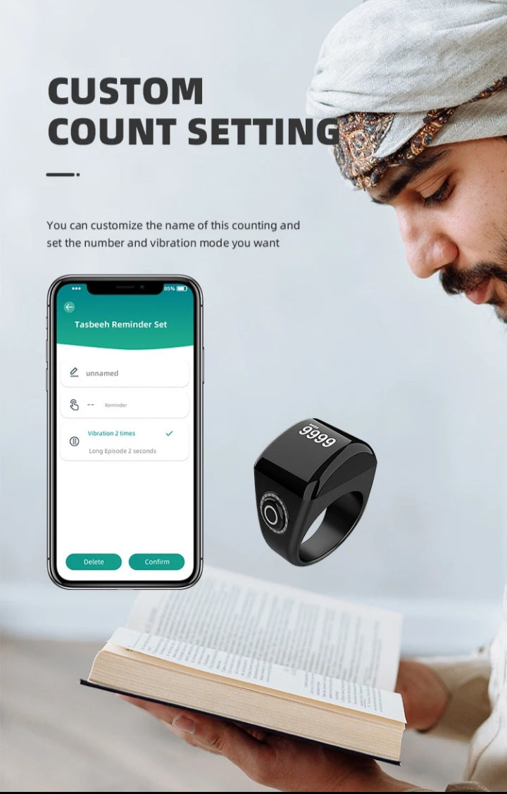 Alliez technologie et spiritualité avec cette bague intelligente de prière. Conçue pour les fidèles, elle permet de compter jusqu’à 999 999 tasbihs et de recevoir un rappel des 5 prières quotidiennes avec alarme Azan. Élégante et pratique, elle devient votre compagnon spirituel de chaque instant.